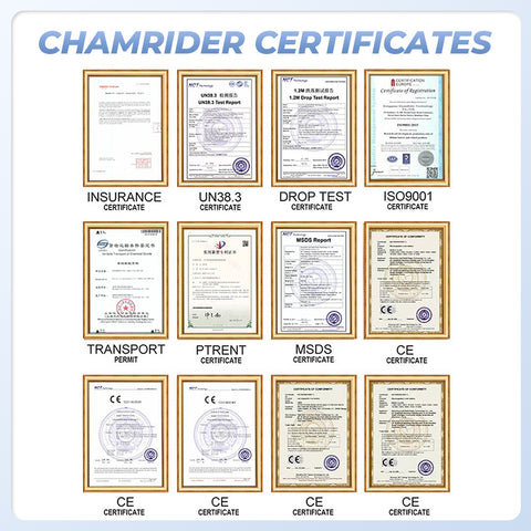 2. Globally Certified for Your Peace of Mind: Trust in the global standard of ChamRider batteries, complying with stringent international certification standards. Our rigorous production and quality control processes ensure that each battery meets the highest performance, safety, and reliability levels.