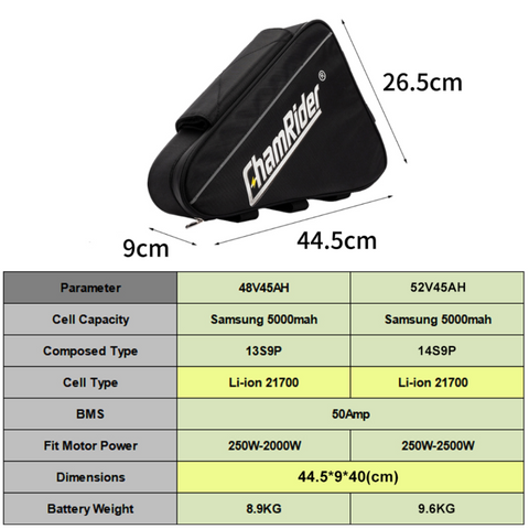 - High Capacity for Extended Rides: With options of 48V45AH and 52V45AH, our ChamRider battery offers high capacity to keep you going further. Powered by Samsung 5000mAh cells, it ensures long-lasting performance.